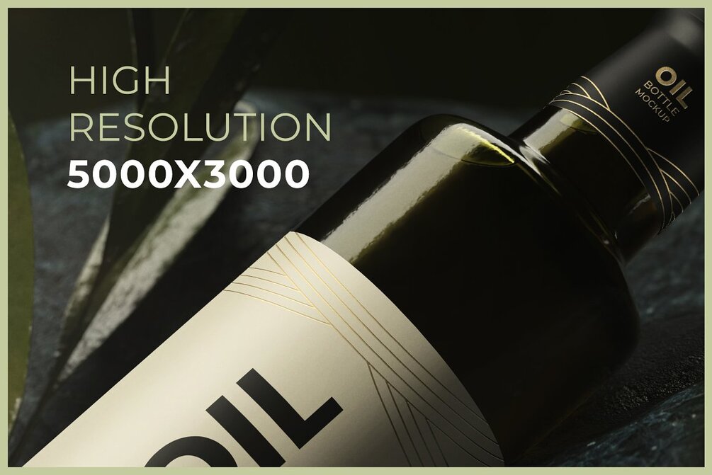 Professional photorealistic mockup of Oil Bottle. Using smart-object place your label in seconds. Label lights & shades are adjustable. Selective Varnish layer available, and you can use any color you want. High resolution 5000x3000px will let you to showcase even smallest details of your label design.