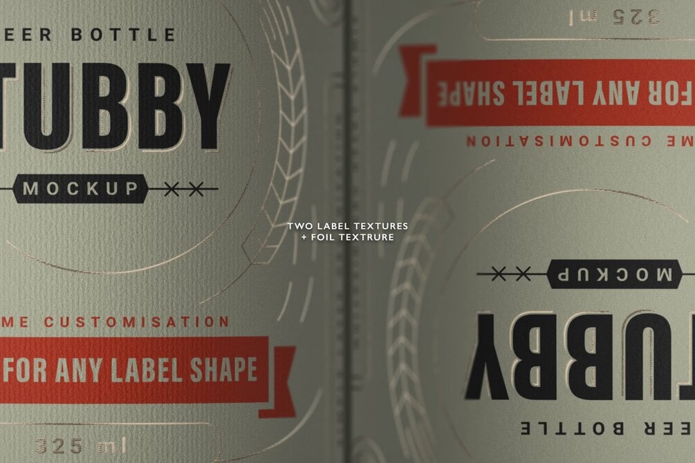 Professional photorealistic mockup of Stubby Bottle. Using smart-object place your label in seconds. Label lights & shades are adjustable. Two different label textures presented. Foil texture available, and you can use any colour you want. High resolution 3000x4000px will let you to showcase even smallest details of your label design.